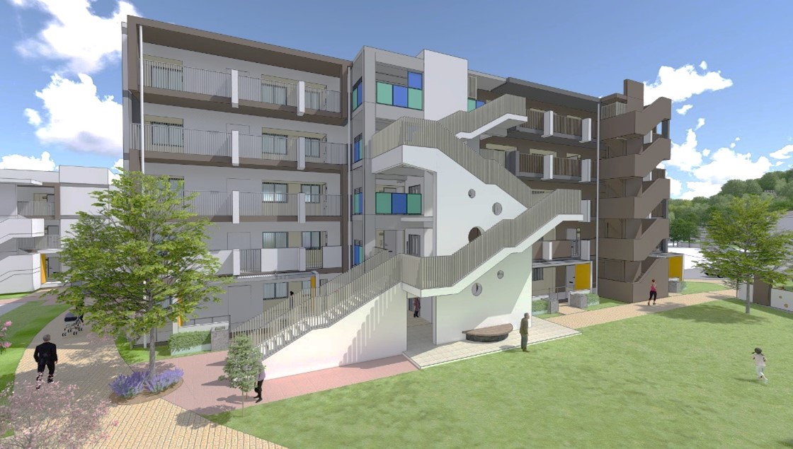 静岡県営住宅のPFI方式による建替事業。昭和46~47年に建設された既存住棟(9棟・282戸)を解体し、4棟・185戸の県営住宅に建て替える。