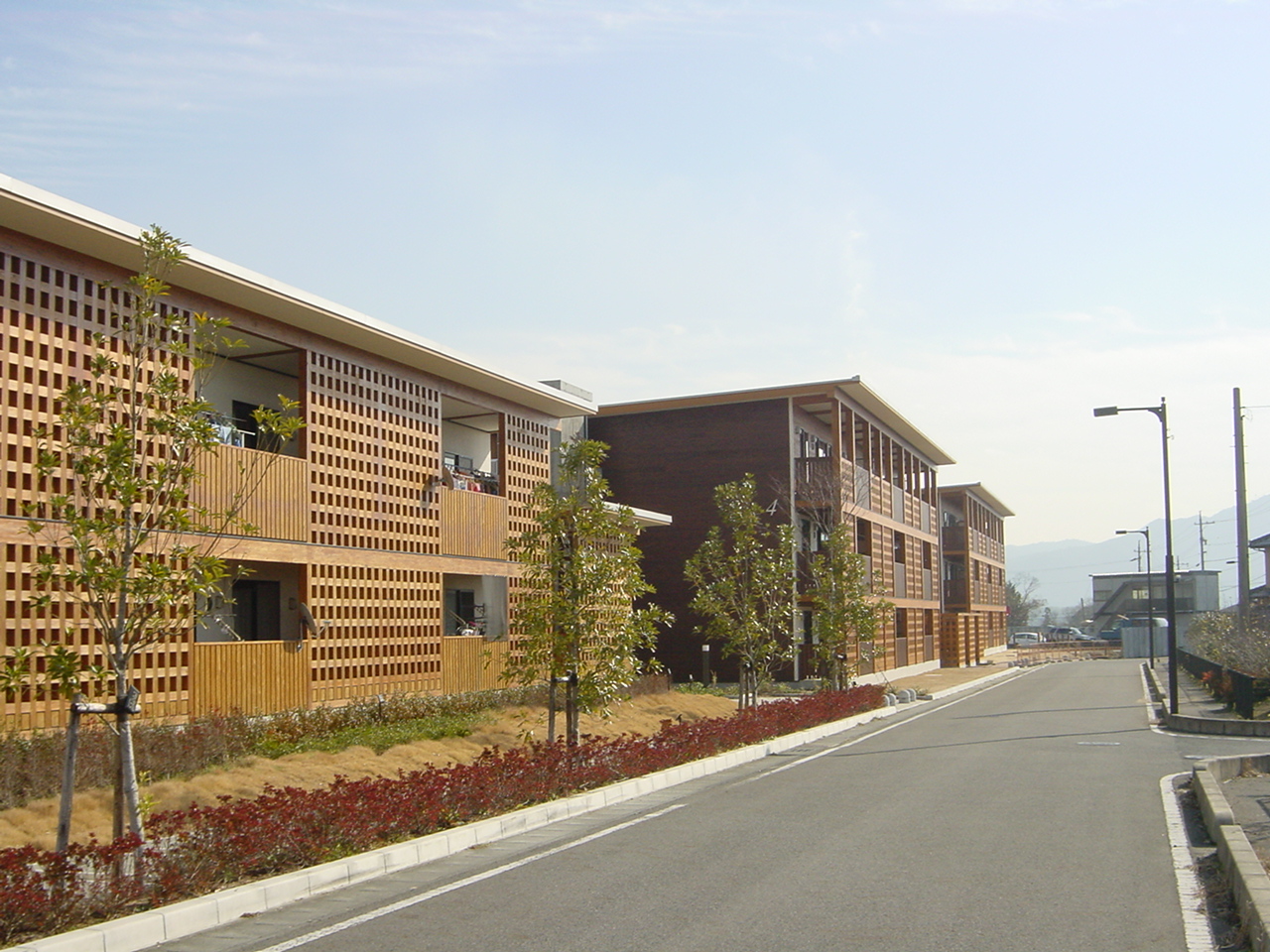 2階建て住棟と3階建て住棟が中庭を取り囲むように配置されており、コミュニティ単位が明確な構成となっている。また、周辺戸建て住宅地との連続性や協調を図るために、外装には積極的に木材を活用している。